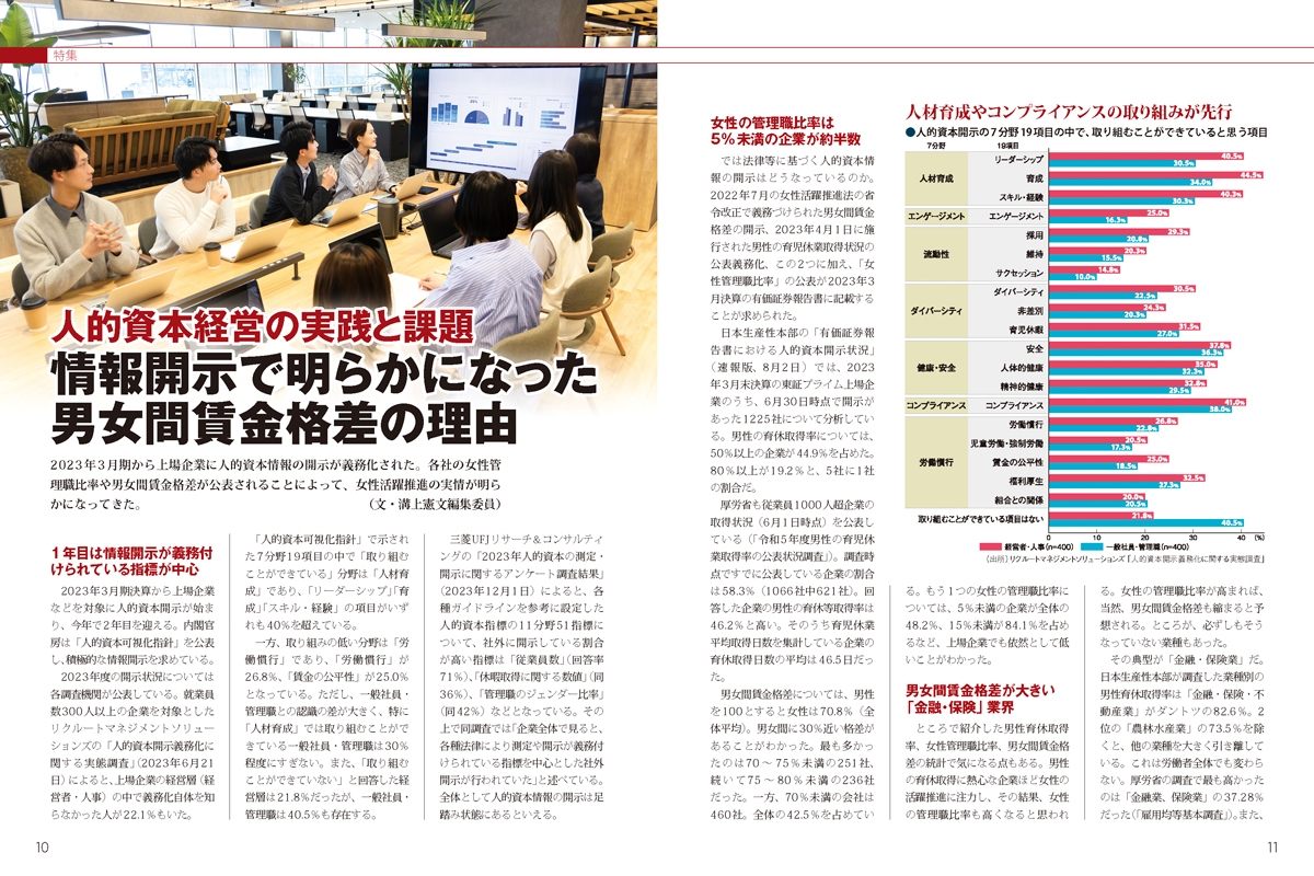 特集として人的資本経営を取り上げ、情報開示で明らかになった男女間賃金格差の理由、人的資本経営の推進に向けた企業の課題や取り組みを紹介しています。また、人事インタビューではソニーグループの企業内大学「ソニーユニバーシティ」について、労働法解説では最新最高裁判決「事業場外みなし労働時間制」「職種限定合意に反する配転命令」について掲載しています。