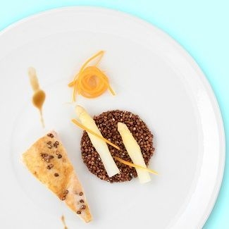 ・鶏の胸肉の蕎麦の実ロースト、白アスパラ、セロリ、カボチャ添え