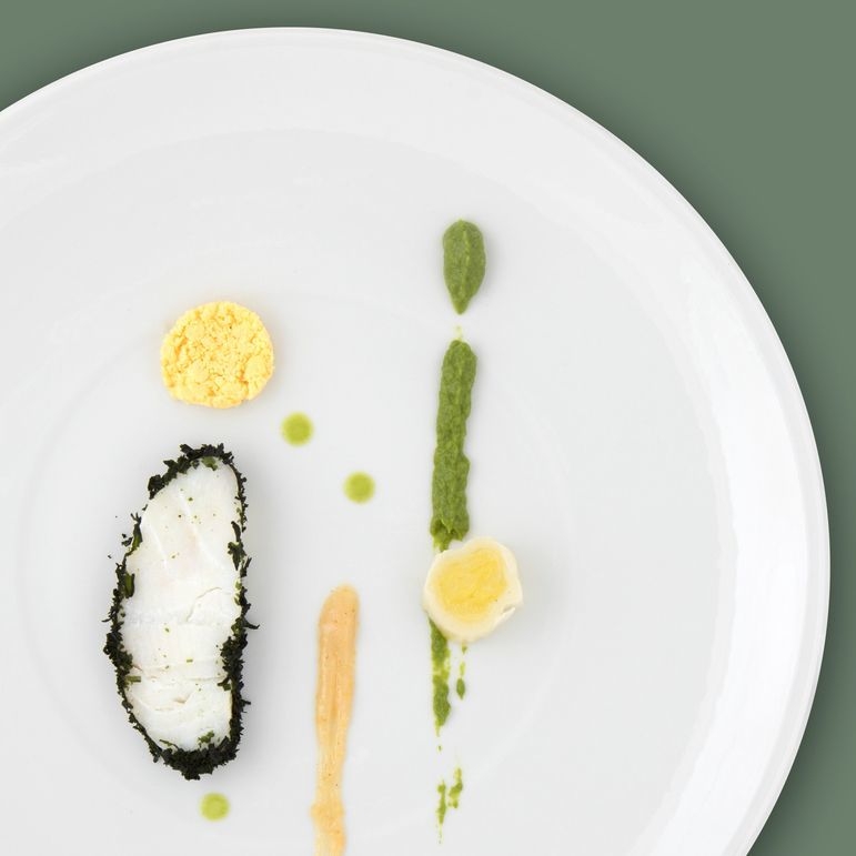 ・鱈の海藻包み、ヴィネグレット風味の葱のミモザ風、バジリコとレモンのソース