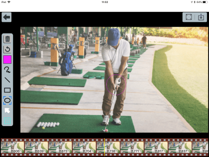 Sports Coaching DELAYには描画機能があり、自分が理想とする動きなどを画面に書き込むことが可能です。画面にマス目を表示したり、体の各部の動きを線で描いたり、要注意のポイントを円で囲ったり、それに合わせて繰り返し練習をすることで、より効果的な練習が可能になります。