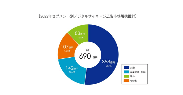 2022年のデジタルサイネージ広告市場規模は前年比119%、690億円と推測されます。交通機関は358億円で全体の51.9%、商業施設・店舗は142億円で全体の20.6%、屋外は107億円で全体の15.5%、そしてその他は83億円で全体の12.0%を占めると推測されます。