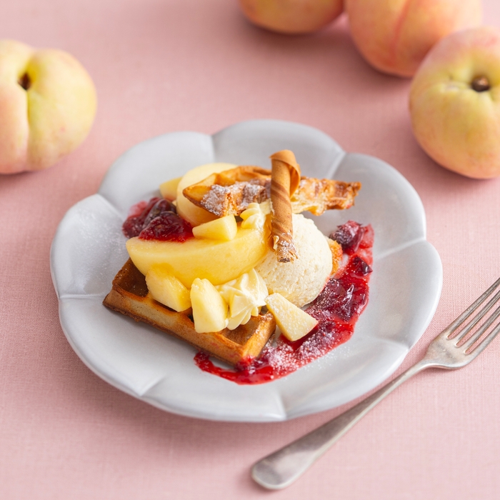 注文いただいてから作る、焼きたてのサクふわワッフルに、旬の岡山市産白桃をたっぷりと。