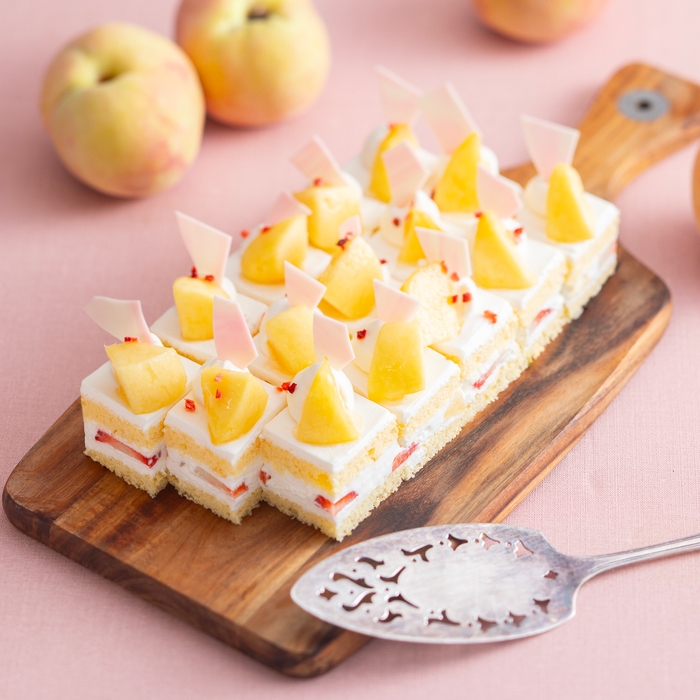 甘く芳醇な香りの岡山県産白桃を飾ったショートケーキ。ふわふわのスポンジにいちごと桃をサンドしました。みずみずしい桃とふんわりスポンジに優しい甘さのホイップクリームでさっぱりとお召し上がり頂けます。
