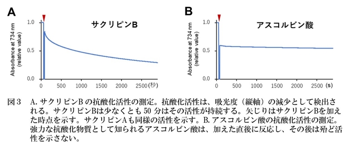 サクリピンA, B の吸収極大波長はともに 320 nm 付近で、日焼けや日焼けによる炎症の原因となる UVA および UVB 領域の波長をよく吸収することが分かりました。また、サクリピン A, B は、紫外線を吸収するだけでなく、アンチエイジングに寄与する抗酸化活性 注6) と抗糖化活性 注7) を示しました。抗酸化活性については、その活性が長時間持続することが明らかとなりました(図3)。また、抗糖化活性については皮膚の真皮の主成分であるコラーゲンとエラスチンの糖化を抑制する効果が確認されました(図4)。これらの結果から、 サクリピン A, B はスキンケアクリーム等への配合剤に適していると考えられます。ヒト皮膚由来の培養細胞に対し てサクリピン A, B が毒性を示さないことも確認されました。サクリピンは食品由来の成分なので、経口サプリメントとしての応用可能性も考えられます。