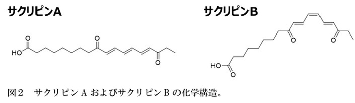 本研究では、スイゼンジノリから 2 つの紫外線吸収物質を単離し、それらの化学構造を決定しました(図2)。これらの物質は、脂肪酸を前駆体とするオキシリピン( oxylipin )類 注4) の化合物で、スイゼンジノリの学名 Aphanothece sac rum と oxy lipin からサクリピン( saclipin A およびサクリピン B と名付けました。サクリピン A とサクリピン B はシス-トランス異性 注5) の関係にあります。ラン藻において、このような化学構造の化合物はこれまでに見つかっていません。 マイコスポリン様アミノ酸やシトネミンとは異なる新しいタイプのラン藻由来の紫外線吸収物質の発見は学術的重要性が高く、注目に値します。