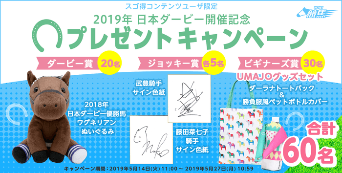 本キャンペーンでは、競馬界のレジェンド<武豊騎手>や話題の女性騎手<藤田菜七子騎手>のサイン色紙、2018年日本ダービー優勝馬<ワグネリアンのぬいぐるみ>、そして女性も嬉しいUMAJOグッズ<ダーラナトートバック&勝負服風ペットボトルカバー>を合計60名様にプレゼントいたします。