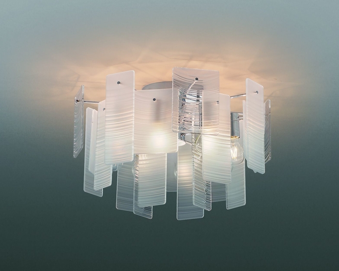 「アーバンシック」という概念で新しく創り出したスタイリッシュなシャンデリアライト。リズミカルに重ね合わせたパネルは軽やかな立体感と透明感を醸し出し、あかりを灯すと波をイメージした波紋柄のパネルが浮かび上がり美しい陰影と優しいゆらぎ感を演出します。