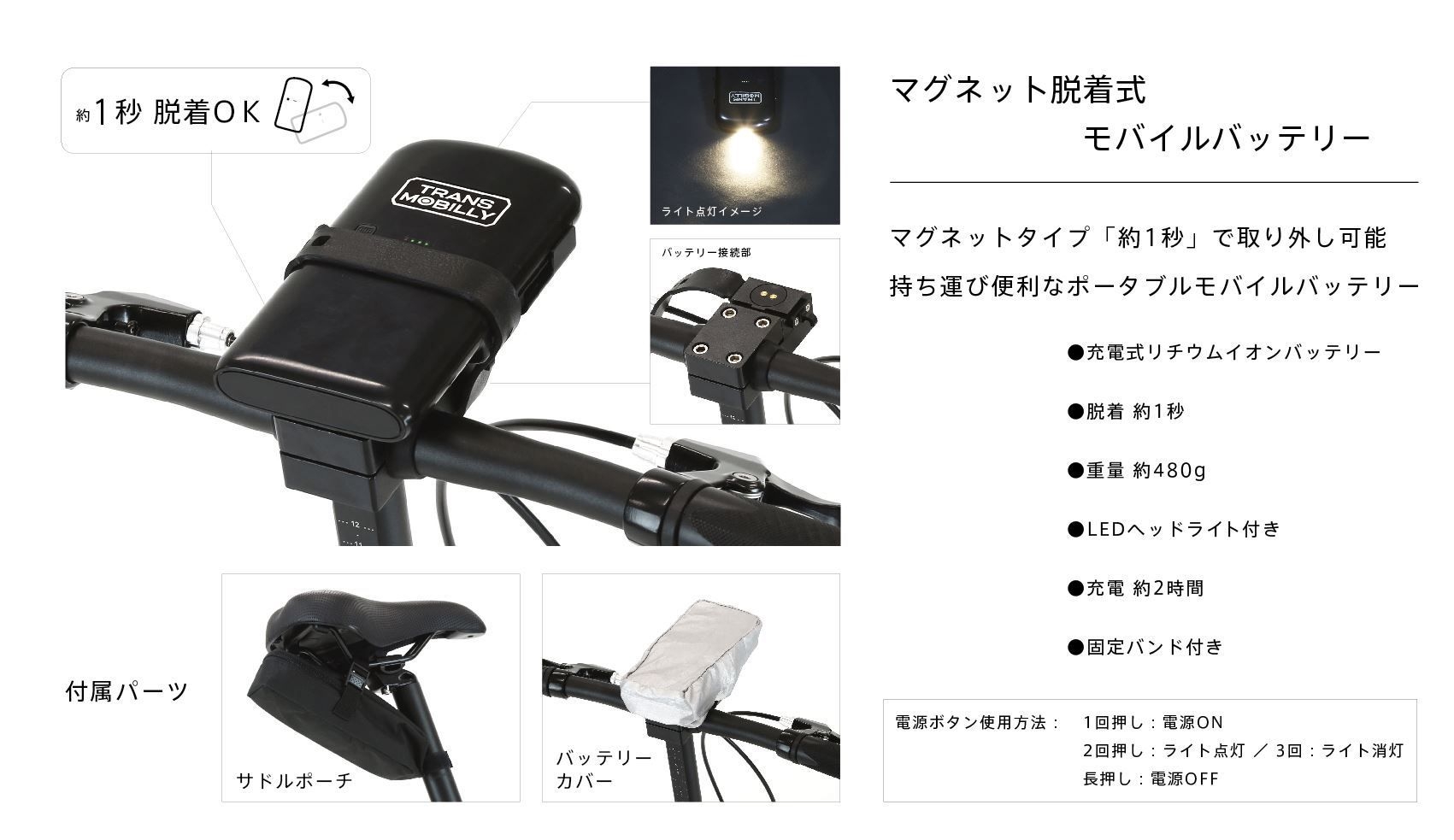 バッテリー脱着の手軽さ、力強い走行、コンパクトかつ軽量でどこへでも持ち出せるコンパクトな自転車「トランスモバイリー」を是非、体感してください。