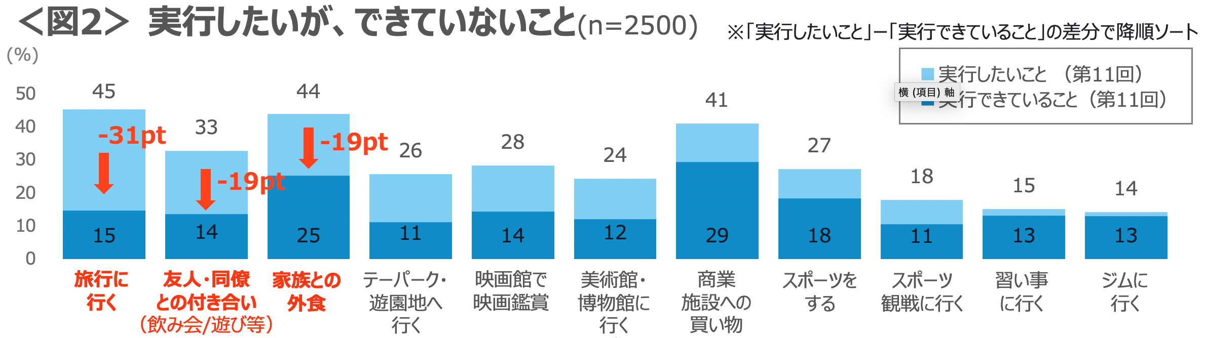 制限緩和が徐々に始まる中、「やりたいこと・できていること」について第2回調査(3月下旬実施)から約6ヶ月ぶりに聴取した。3月下旬よりも「やりたいこと」はどの項目も軒並み上昇したものの、実際に「できている」との回答は横ばい傾向で、できていることは少ない結果となった。特に「旅行に行く」「友人・同僚との付き合い(飲み会・遊び等)」「家族との外食」において意向と実行の差が大きくみられた。<図2>外出への不安は徐々に薄れつつあるものの、移動自粛のあった旅行や周囲の人との外食は未だ気持ちを抑えている様子が伺える。