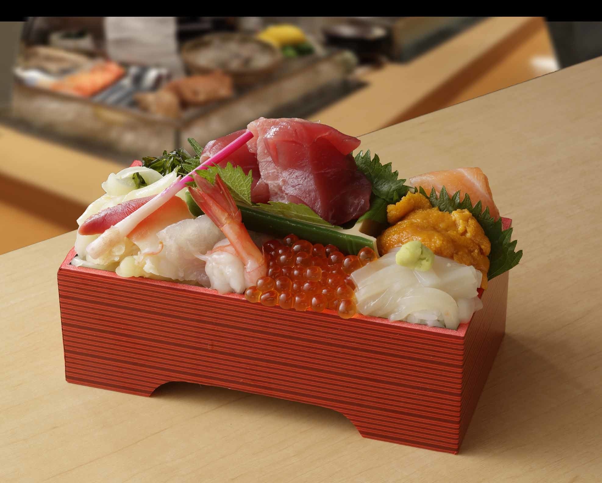 戸井産まぐろ、いくら、甘海老、うに、活いか、海峡サーモン、ヒラメが溢れんばかりに盛り付けられた弁当。