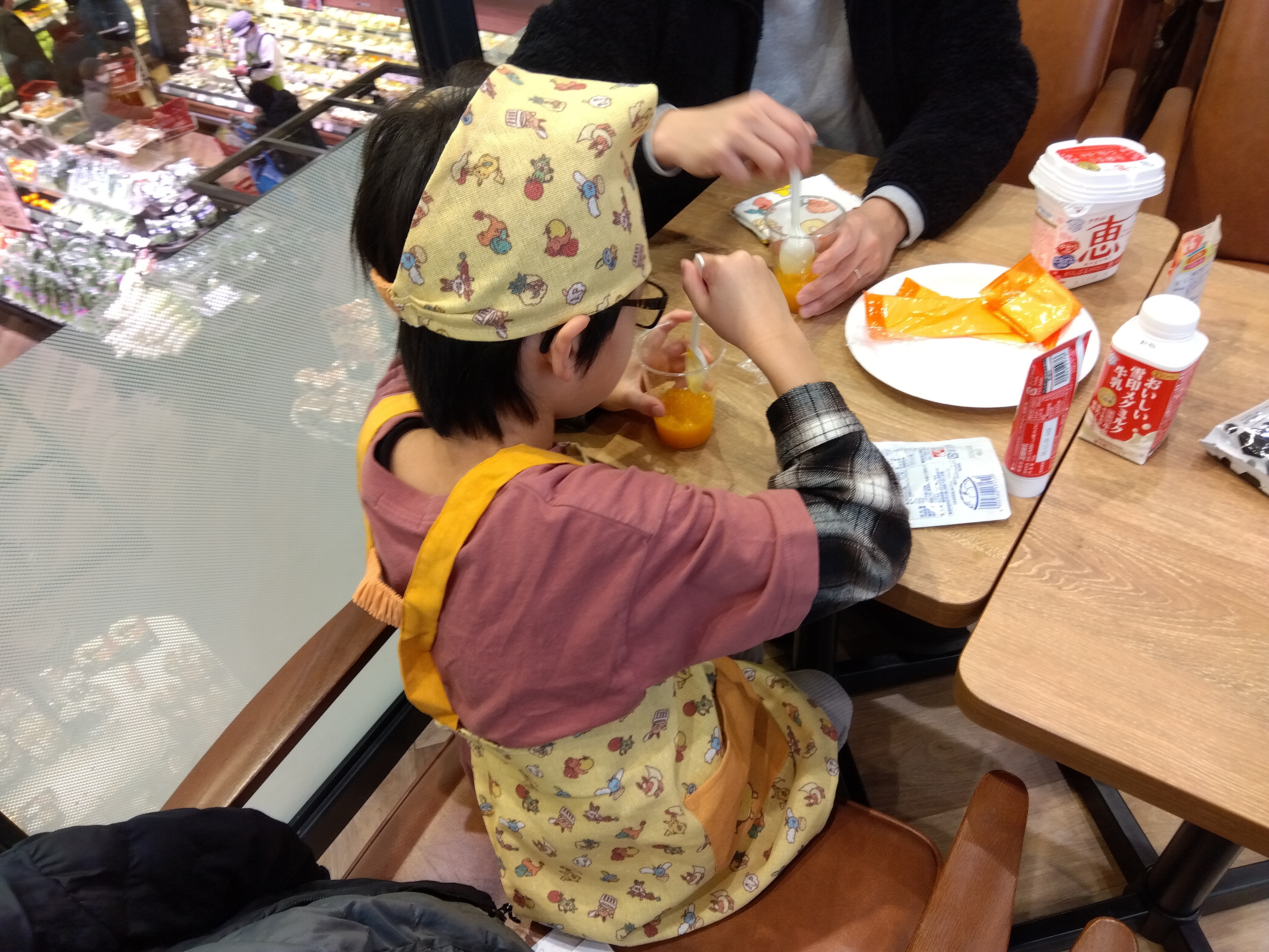 雪印メグミルクからは、牛1頭からどれくらいのミルクが搾れるのか、ミルクからどんな食べ物が作られているかなどの話や、潰したみかんにヨーグルト、練乳、牛乳を混ぜて作る“ラッシー作り”を体験いただきました。