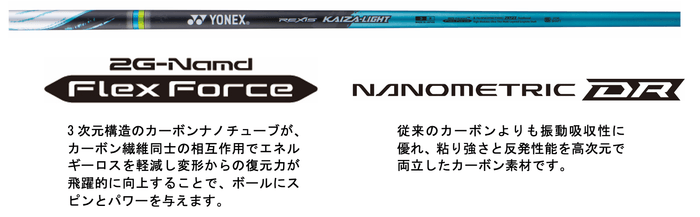 「REXIS KAIZA-LIGHT」は、先進カーボン技術「2G-Namd™ Flex Force(ツージーエヌアムドフレックスフォース)※1」と複合極薄マルチレイヤードグラファイト、「ナノメトリックDR※2」を複合したことで軽量且つ高強度を実現しました。これにより、強靭なしなりを維持し、素早い復元力を発揮するため、インパクト時の当たり負けを軽減。一気に振り抜ける感覚を実現します。