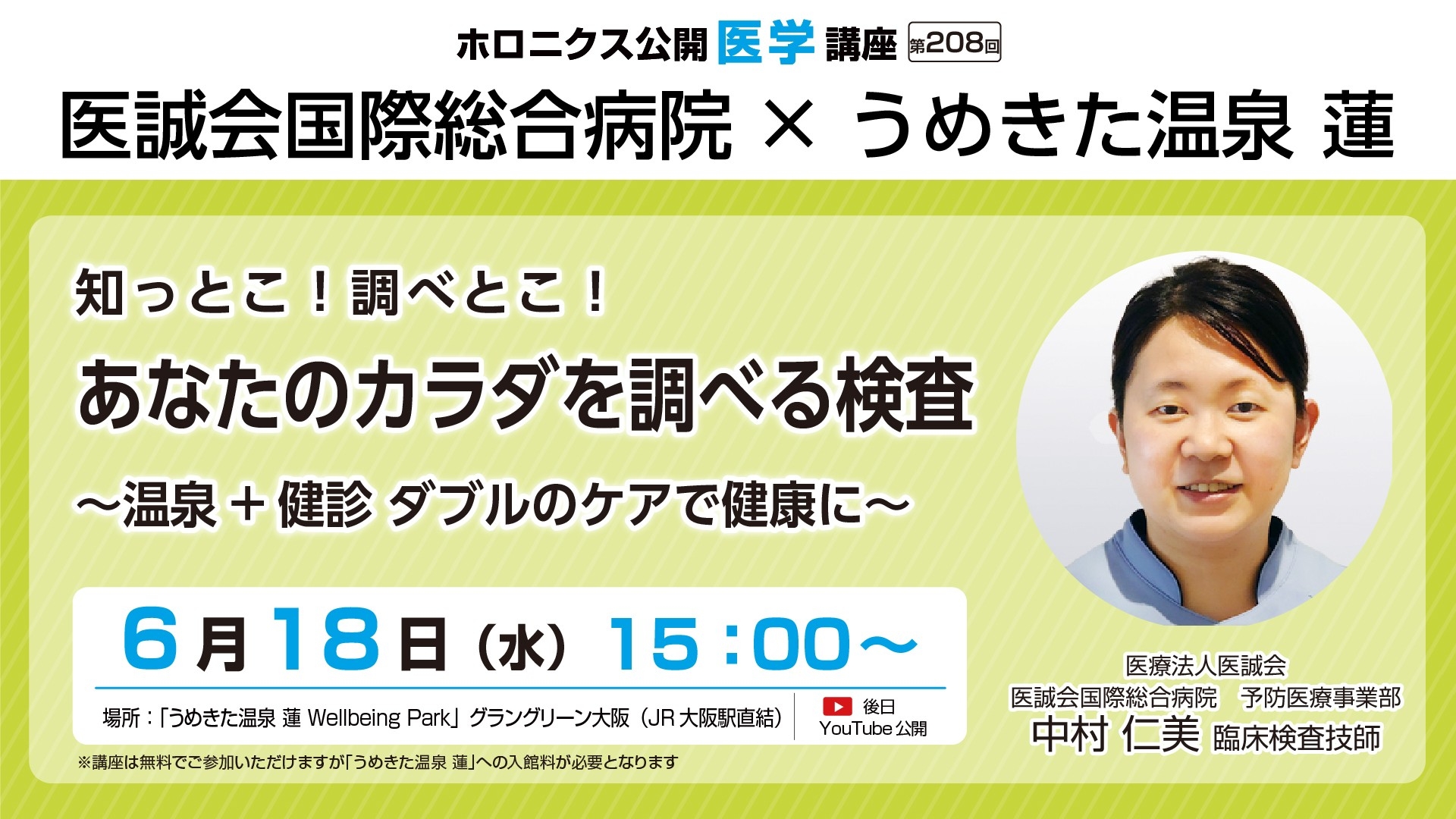 6月18日(水)にはその第2回として、「~温泉 + 健診 ダブルのケアで健康に~」をテーマに、医誠会国際総合病院 予防医療事業部 中村 仁美 臨床検査技師が登壇。誰もが一度は耳にしたことがある“検査”に着目し、「あなたのカラダを調べる検査」について、日常生活との関わりや、気づきにくい病気のサインを解説します。