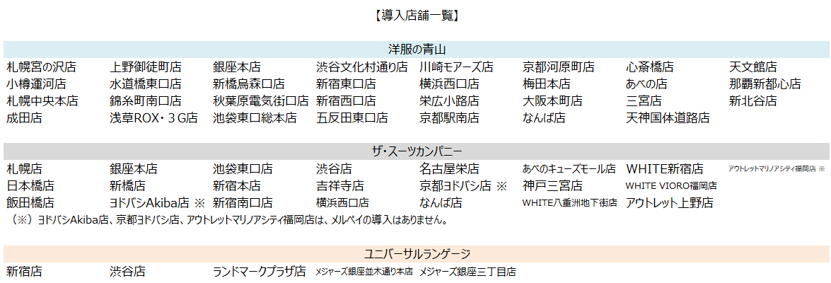 青山商事株式会社(本社:広島県福山市/代表取締役社長:青山理(おさむ))は、「洋服の青山」「ザ・スーツカンパニー」「ユニバーサルランゲージ」の主要58店舗で、スマートフォンを使用したQRコード決済サービス「LINE(ライン) Pay(ペイ)」と「メルペイ」の運用を2月1日(土)から開始します。