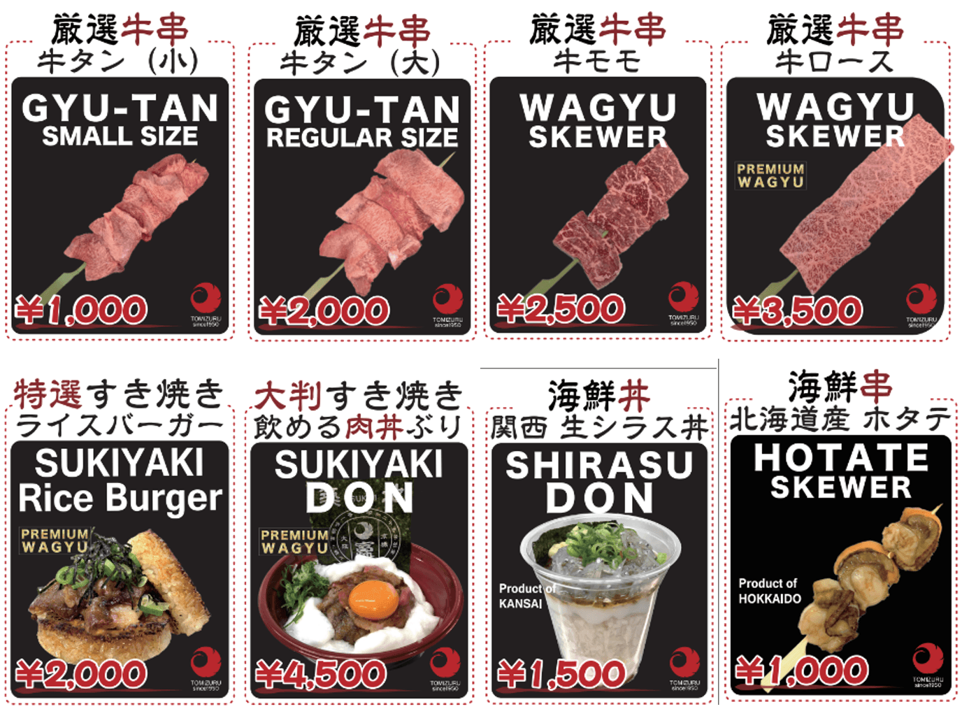 創業当時から変わらない秘伝のたれを使用し、柔らかくてきめ細やかな肉質、濃厚な旨味、富鶴の職人が厳選した上品な甘みが特徴の和牛大判ロースを使用したスキヤキライスバーガーやスキヤキ丼、熟練の職人による肉を手切りで、1本1本丁寧に手串打ちにこだわった牛串。牛肉だけでなく富鶴が厳選した食材を使用した商品ラインナップも取り揃えています。