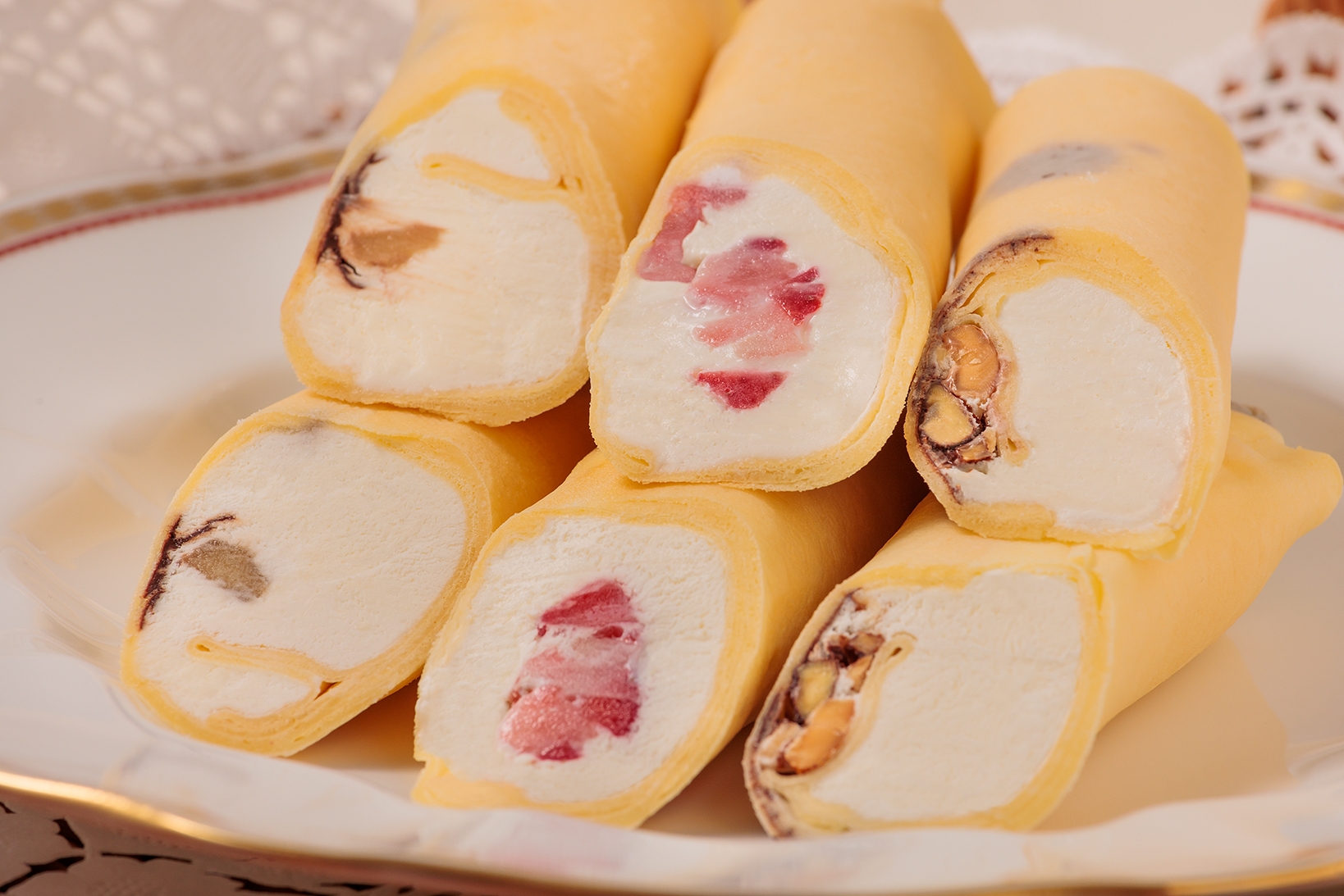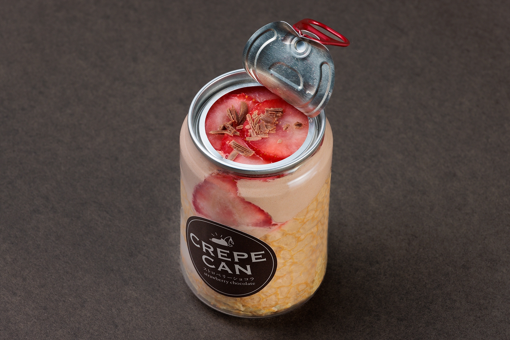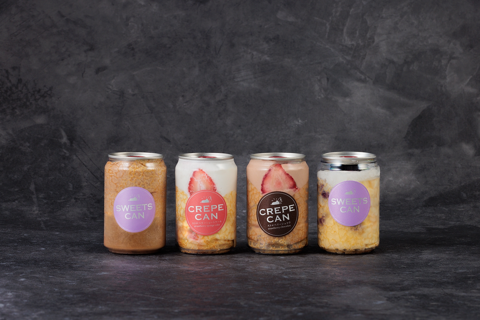 クリア缶の中にクレープを巻き、パイ・スポンジケーキ・生クリーム・イチゴなどを二層に仕上げました。 種類は、ストロベリーショートケーキ、ストロベリーショコラ、ブルーベリーチーズ、ショコラプリンの4種類を展開。