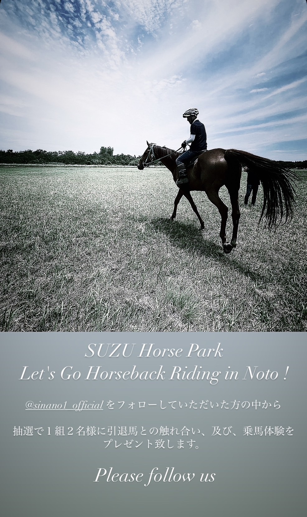 以下の期間中に、Instagram(@Sinano1_offical)をフォローいただきました方の中から、抽選で1組2名様に能登半島 珠洲ホースパークでの引退馬との触れ合い、及び、乗馬体験をプレゼントいたします。
