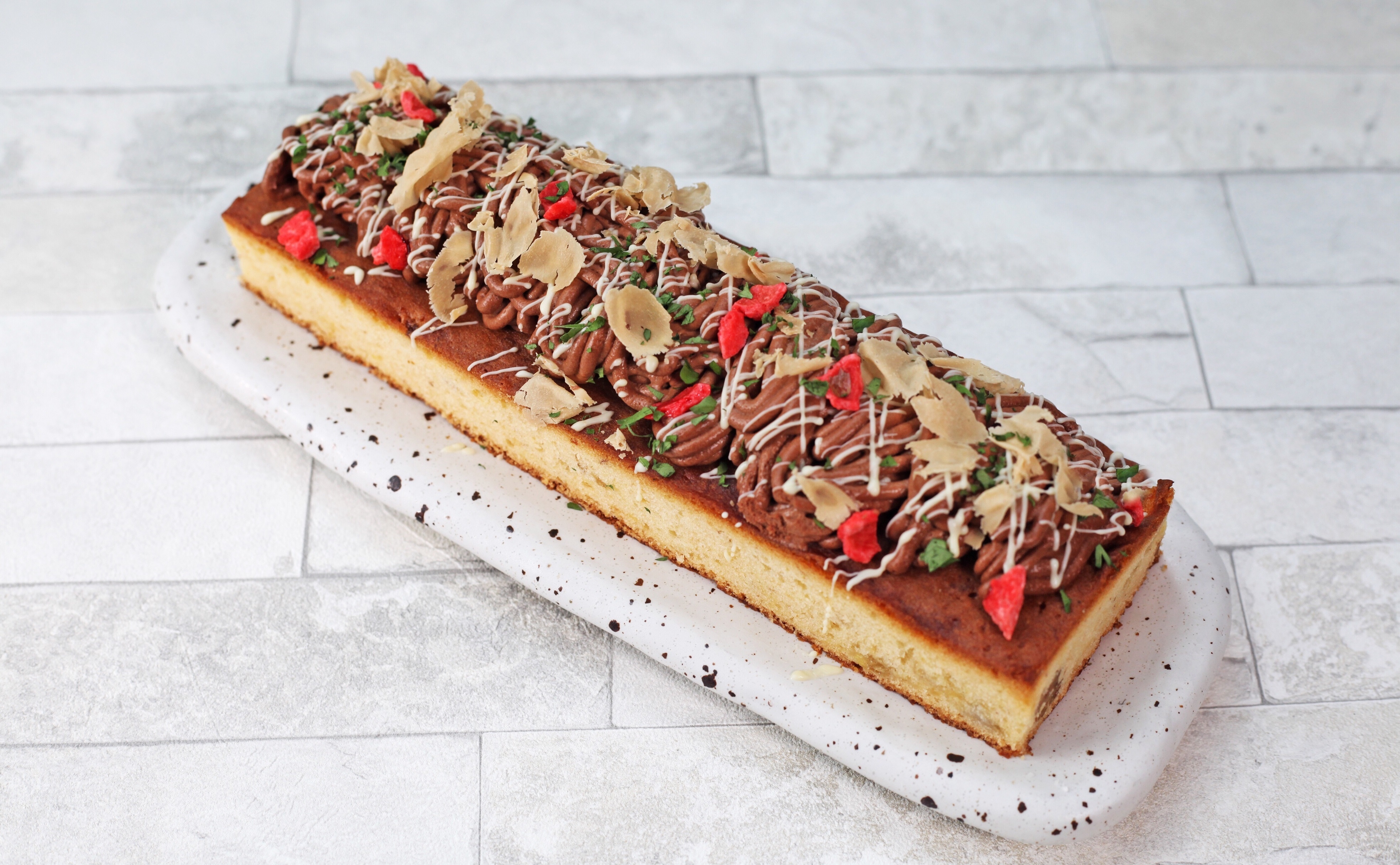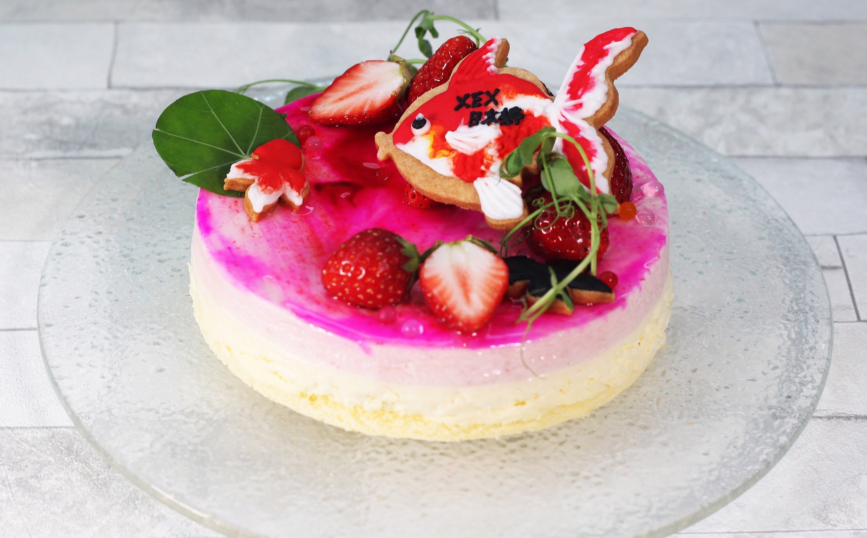 愛らしい金魚に見立てたミルフィーユ。苺で鱗を表現し、泳ぐ金魚を秋めくフルーツとお花で華やかに彩りました。サクサクの食感でさっぱりとお召し上がりいただけます。