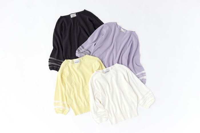 ボリューム袖に、シアーボーダーのランダムなライン入りで、ベーシックの中にさりげないデザインポイントが効いたトップスです。