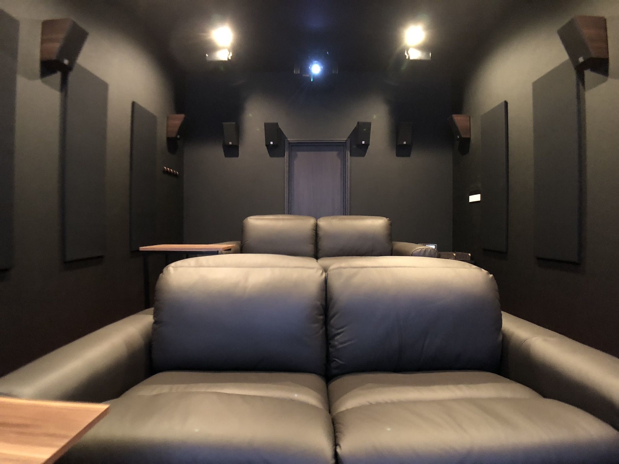 「映画館を貸し切る」という贅沢。それをぎゅっと凝縮すべく、最多でも4人までのプライベートな視聴環境に、(1)大画面サウンドスクリーン&4K/3Dプロジェクター、(2)イマーシヴ・サウンドを含む最新の立体音響、(3)防音&シネマライクな内装、照明、(4)ラグジュアリーな電動リクライニングシート、(5)誰でも簡単に操作できるホームオートメーションといった装備を家庭用機器を使って詰め込みました。