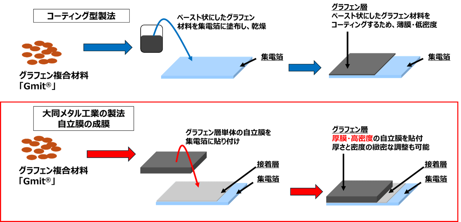 従来のグラフェン電極は集電箔にペースト状にしたグラフェン材料をコーティングしているため、厚膜電極(膜厚130μm以上)の生産は不可能でしたが、大同メタル工業株式会社は株式会社マテリアルイノベーションつくばが開発した「Gmit(R)」の技術を用いたグラフェン複合材を用い、キャパシタ用電極シートの製造で培った製造工程に自社開発の成膜技術を加え、高密度(0.7~1 g/cm3)で、厚膜(膜厚130~250μm)のグラフェン厚膜電極の製造に成功しました。
