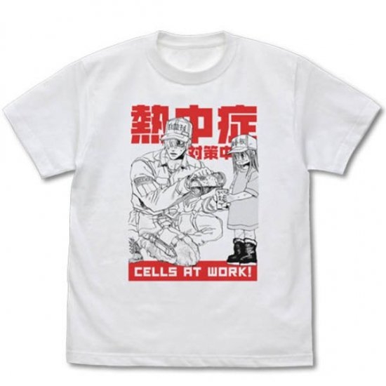 今回ご紹介するのは。。。はたらく細胞、白血球Tシャツです。白地のTシャツに赤い文字が良く映える、男女問わずお使いいただけるデザイン♪白血球のお兄ちゃん達が私たちを守ってくれます。お兄さんの後ろには「熱中症対策中」の文字が。