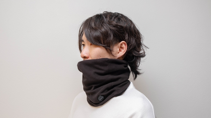 本製品は、カーボンナノチューブヒーターを前後に搭載した電熱ネックウォーマー。電源をONにしてから約7秒ほどで肌に熱を感じることができ、外部の冷気から首を守ります。