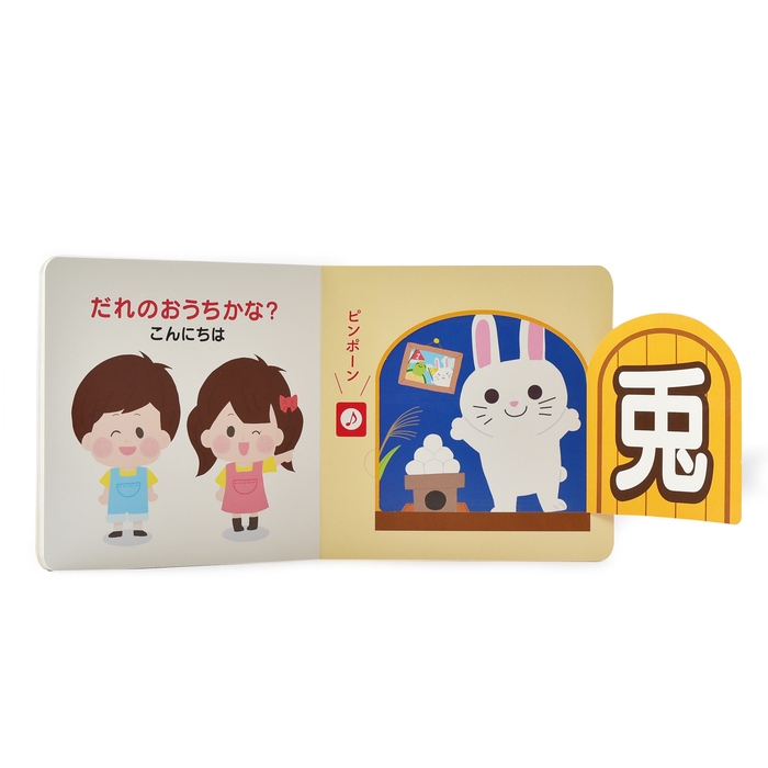 一見、文字だけのシンプルな絵本だが、扉をめくると動物のイラストと共に関連する童話のモチーフやアイテムが描かれている。犬であれば「花咲か爺さん」の桜、兎は「ウサギとかめ」やお月見、豚は「三匹の子豚」。さらに、「犬」「猿」「鳥」の並びから桃太郎を連想することもできる。知らなくても問題ないが、知っている子は「これ、あのお話だ!」という繋がりを発見できる工夫が盛り込まれている。