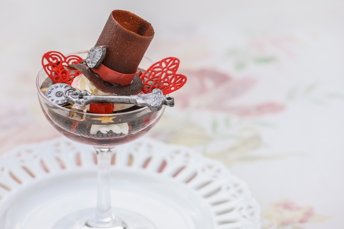 さらにお子様向けのメニューや、物語に登場する”何でもない日”のパフェ・“帽子屋”をイメージしたパスタ&スープなどのオプションもご用意しています。