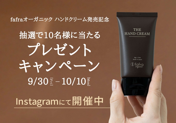 株式会社G.Oホールディングス(大阪府大阪市)は、オーガニックライフスタイルブランド「fafra organic(ファフラオーガニック)」の新作、『fafraオーガニック ハンドクリーム』を、抽選で10名様にプレゼントするキャンペーンを9月30日より開催いたしました。