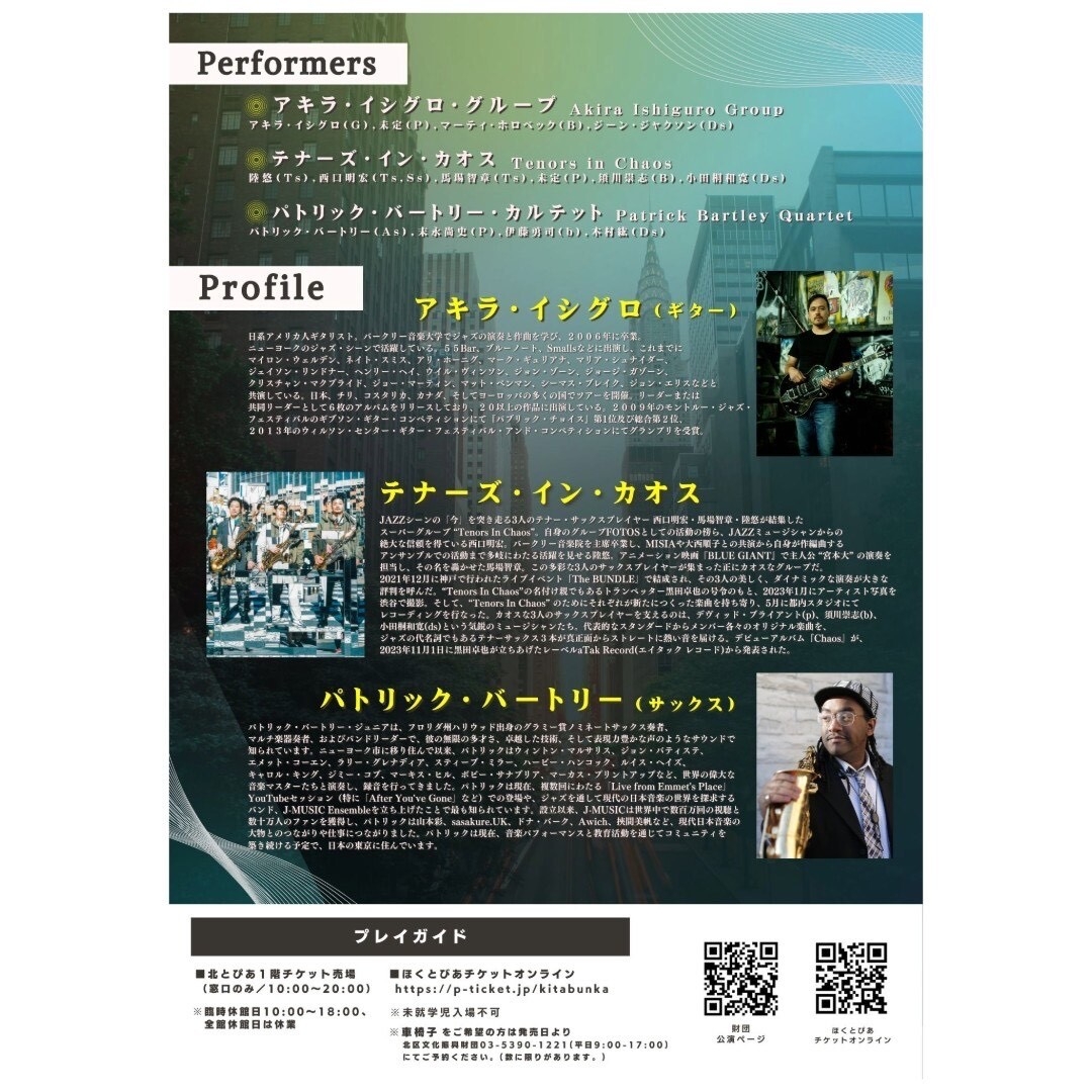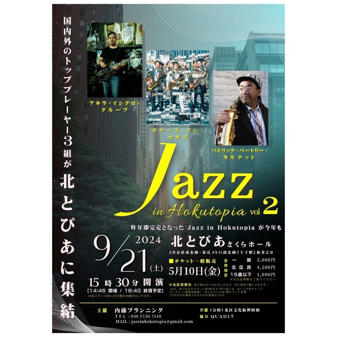 Jazzコンサートの運営・企画を行う内藤プランニング(所在地:東京都中央区、代表:内藤 康雄)は、国内外から未来のジャズシーンを創る最高峰のジャズアーティスト3組が集結するジャズフェスティル『Jazz in Hokutopia Vol.2』を2024年9月21日(土)に東京都・北区の北とぴあ(さくらホール:1,300人収容)で開催します。