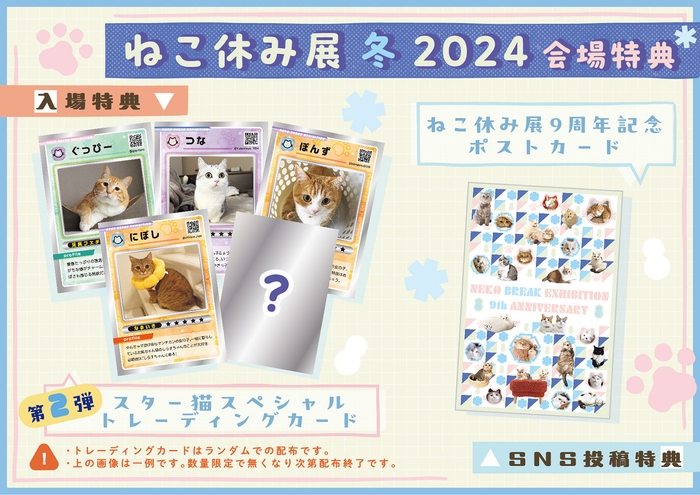 猫の祭典『ねこ休み展』が2015年の開催から9周年を迎えることを記念して、来場者特典として記念オリジナルトレカを限定配布いたします。昨年より新たなスター猫として加わった、「つな・まよ・ごま」や「ぽんもち日記」たちの限定トレカが登場!さらに、会場内の様子を撮影後にタグづけしてSNS投稿してくれた方には、限定ポストカードをプレゼントします!