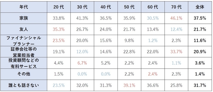 株式投資について普段、情報交換などの会話をする相手についても質問しました。その結果、若い世代ほど数値が高くなる傾向にあったのは「友人」と、意外にも「ファイナンシャルプランナー」でした。