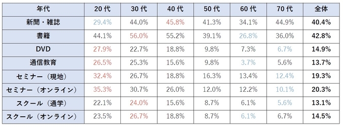 なお、全体として最も割合が高かったのは「書籍」の42.8%で、手頃であることから学習の入り口になっていることがわかります。その一方で、「DVD」や「通信教育」「セミナー」「スクール」といった、ある程度のお金を投じる必要のあるツールについては20代・30代といった若い世代の割合が高く、ここからも、若い人ほど株式投資の学習に積極的にお金を使っている実態が見えてきます。