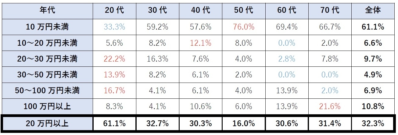 次に、株式投資について学ぶために何らかを購入したことがあると回答した288名を対象に、これまでに学習のために使った金額について質問しました。その結果、20万円以上を使った人の割合は20代が最も高く、61.1%となりました。全体の32.3%を28.8ポイントも上回り、突出して高い結果となっています。