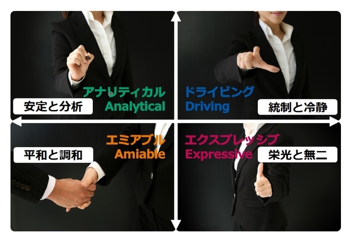 1968年にアメリカの産業心理学者であるデビッド・メリル氏が提唱したコミュニケーション理論。人の言動を4つのスタイルに分けて分析し、相手が望ましいと感じる対応を探し、選択する方法として活用されています。「感情表現」と「主張」、それぞれの度合いにて判断を行います。
