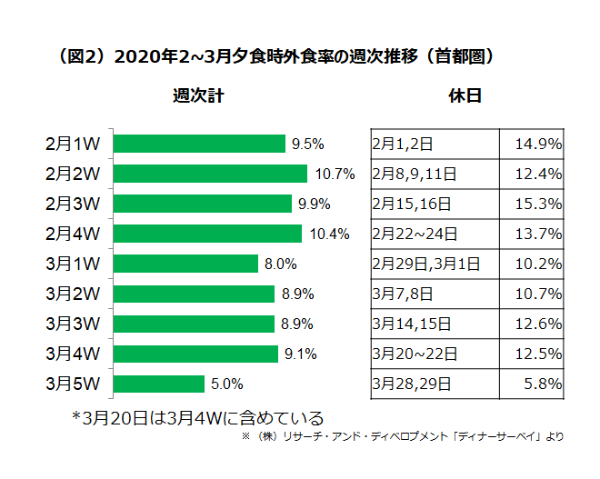 ●首都圏週末の外食率は、3月末週で6%。それ以前はイベント自粛要請中でも10~15%の高水準。(図2)