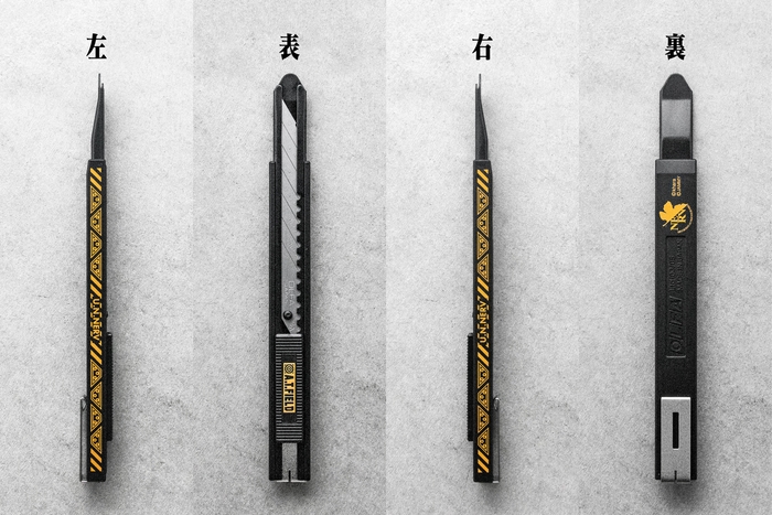 劇中に登場する「NERV」のメカニカルな構造物や装備品のイメージを、ワークツールとして落とし込んだデザインのカッターナイフです。NERVマークが入る本体樹脂部分はタフなイメージのマットブラック塗装を、金属のブレードホルダー部分には鈍く輝く美しさが特徴的なセミグロスブラック焼付塗装仕上げをそれぞれ施した質感の高いアイテムです。