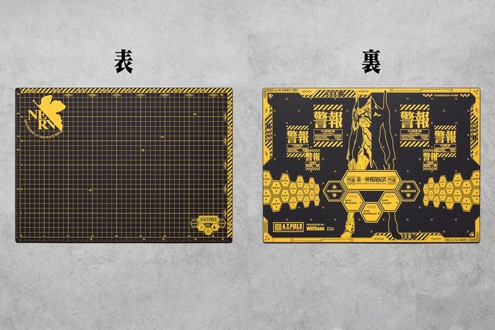 「A.T.FIELD 細工カッター NERVモデル」と「A.T.FIELD カッターマット A3 NERVモデル」は、エヴァンゲリオンのワークブランド「A.T.FIELD EVANGELION WORK」とカッターの国内トップメーカーであるオルファがコラボレーションした、作中に登場する「NERV」をイメージした細工用カッターナイフとA3サイズ(420×297mm)よりもひと回り大きなサイズのカッターマットです。