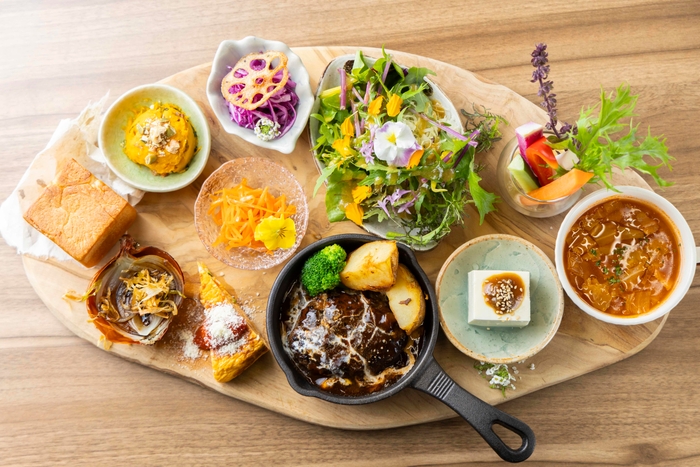 地元野菜を贅沢に使用した手作りのデリ惣菜。秩父味噌や三代目清水屋さんの豆腐など、地元の恵みをたっぷりと詰め込んだ大満足のプレート。メインは武州和牛を使用したデミグラスハンバーグまたはシーフードグラタンの2種類から選べます。