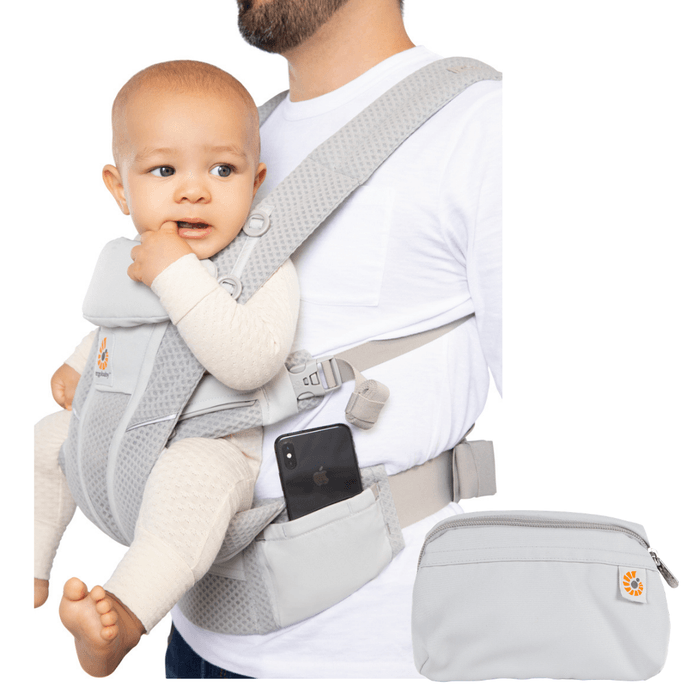 ICカードや鍵など小物を入れられるウエストベルトのサイドポケットとベビーキャリアに装着できるポーチ付き。