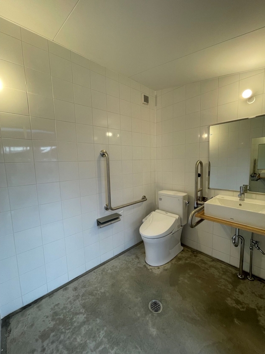 もう1部屋は男女兼用になっていて、車椅子ごと利用することができ、スライド式ドアと手すき付きのバリアフリー設計になっています。