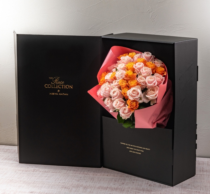 スペシャルボックスフラワー「ローズミックス」は、日本最大の湖・琵琶湖のそばに位置する滋賀県守山市で、55年以上にわたってバラ農園を運営する國枝バラ園が生産するバラを、高級感引き立てる日比谷花壇オリジナルのスペシャルボックスでお届けします。國枝バラ園が自信を持って育てた、花弁が美しく咲き開くこだわりのバラ。今年の日比谷花壇の母の日のメインテーマである「ありがとう」にちなみ、優しさをまとった淡いピンクと元気をもらえるオレンジの大輪バラ39(サンキュー)本を贅沢に束ねました。スペシャルボックスを開けると、“花の女王”と呼ばれるにふさわしい魅力にあふれたバラの花束が現れ、特別な瞬間と感動をもたらします。