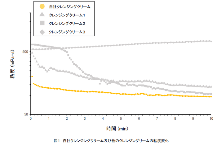 自社クレンジングクリーム及び他のクレンジングクリームについて、「なめらかさ」「のびの良さ」など使用感に関わる物性評価に有用な粘度を測定する測定器(定常流測定機)を用いて、試料に一定の力を加え続けた際の粘度変化を測定しました。その結果、他のクレンジングクリームは変動がない、または粘度が低下するのに時間を要するのに対し、自社クレンジングクリームは測定開始直後に粘度が急激に低下し、その後は非常に低い粘度を保つことが確認されました(図1)。