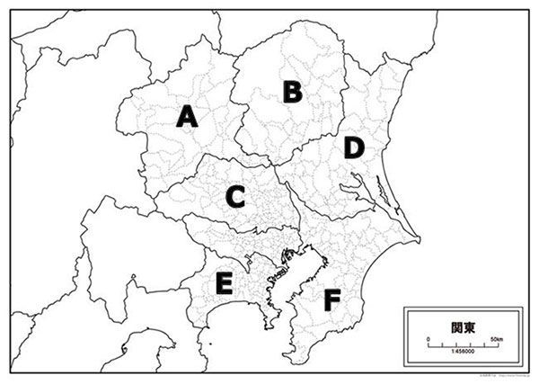 正解は、A:群馬県、B:栃木県、C:埼玉県、D:茨城県、E:神奈川県、F:千葉県
