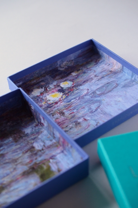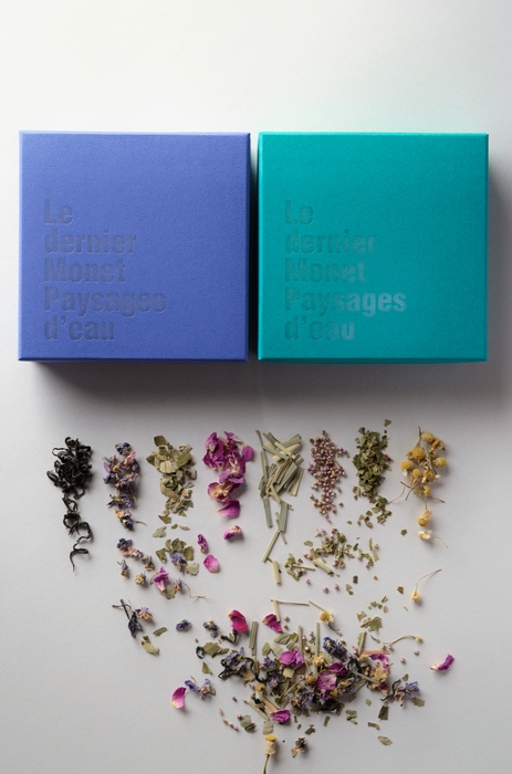 名古屋在住のティーブレンダー佐藤 智美氏によるオリジナルティーブランド「PFLANZEN-APOTHEKE」と「モネ 睡蓮のとき」豊田展がコラボしてお届けする、〈睡蓮〉の世界を再現した、豊田限定のオリジナルティー!蓮花の香りを着香したオーガニック緑茶と蓮の葉を主軸にスミレ、ダマスクローズなどの花をあしらい、水辺の植物をイメージした柑橘系ハーブと共に甘く華やかに香り立ちます。 8種類の繊細な材料が絶妙なバランスでブレンドされた茶葉は、湯を注ぐと睡蓮の絵画のような色彩がティーポットに広がり、味と香りだけでなく、視覚的にも展覧会での感動を追体験できる特別なブレンドティーです。オリジナルティーは、本展覧会のために製作した限定ボックス入り。デザインは2種類。熟練の職人による貼り箱仕様で、箱の内側にも「睡蓮」の世界が広がります。お茶を飲み終えた後も展覧会の思い出の品として長く愛用いただけるデザインです。