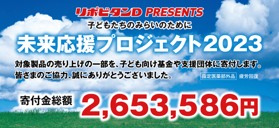 大正製薬株式会社[本社:東京都豊島区 社長:上原 茂](以下、当社)は、2023年秋~冬にかけて実施した「子どもたちのみらいのために 未来応援プロジェクト2023」の集計結果をまとめ、総額2,653,586円を子ども向け基金や支援団体に寄付することを決定しました。