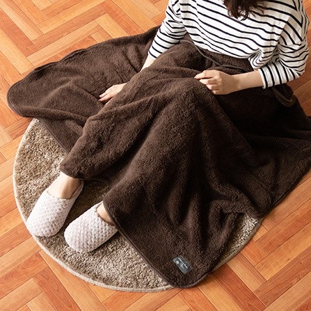 こちらは100×140の大きさのブランケット。羽織る、膝に掛けるの2wayで使用できる。