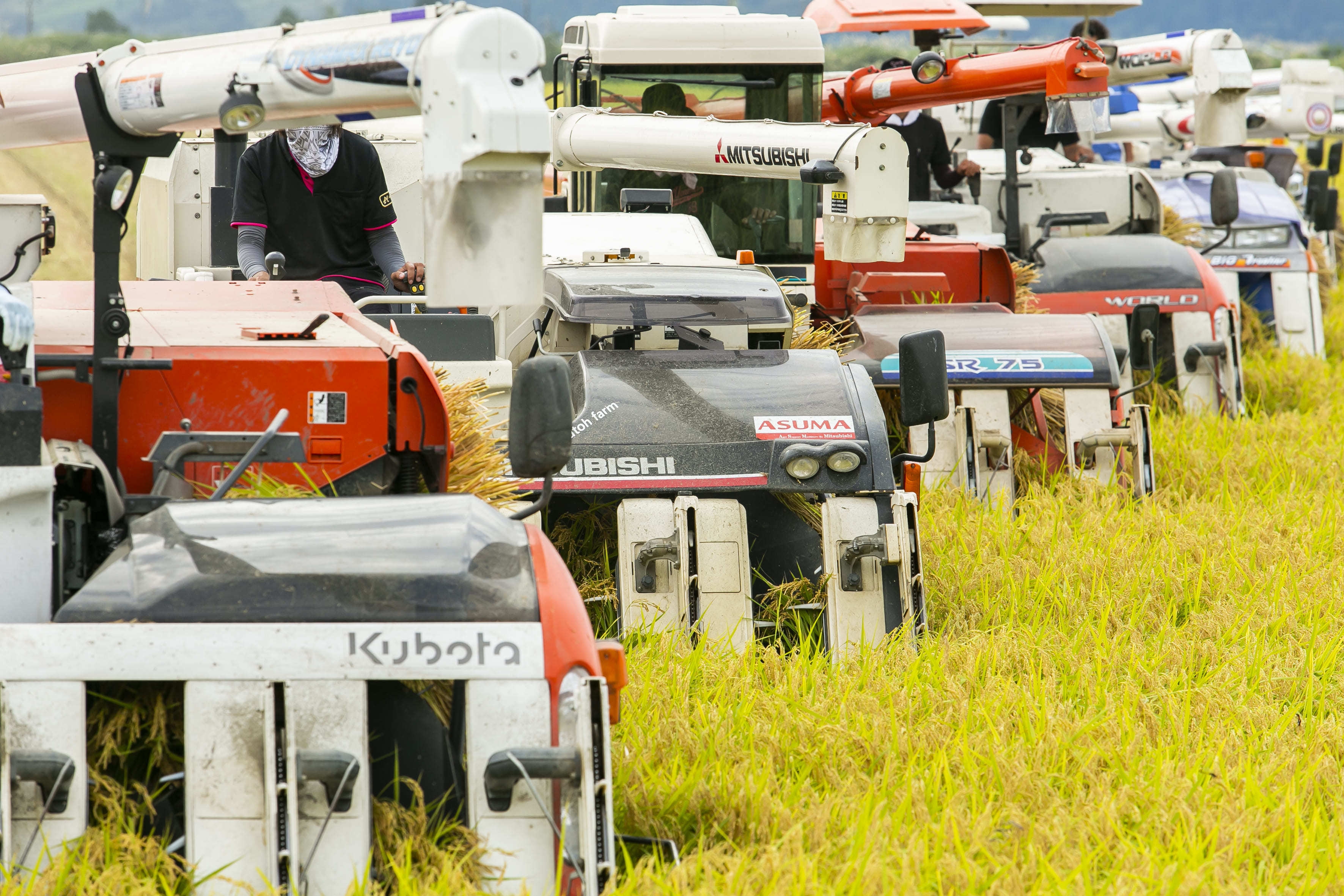 20台のコンバインで一斉に稲刈りをする風景はインパクト大。必見です。