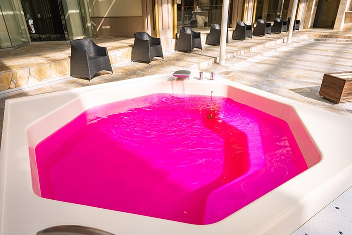 プールサイドに設置したお風呂のお湯がカラフルなピンクやブルーになる「色つきバス」はお子様に大人気です。